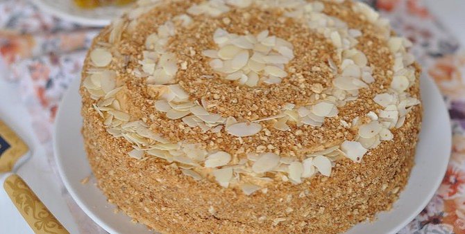 - Всю массу делим на 2 части и поочередно выпекаем каждую по 40 минут. После того, как коржи остынут, укладываем их друг на друга, смазывая сгущенкой. Лакомство лучше убрать в холодильник для пропитки.