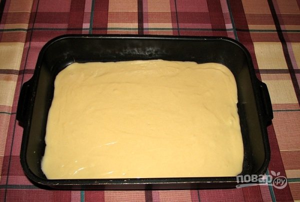 Застелите противень пергаментом, вылейте на него тесто, равномерно распределив его лопаткой. Разогрейте духовку до 170-180 градусов. Выпекайте минут 25-30.