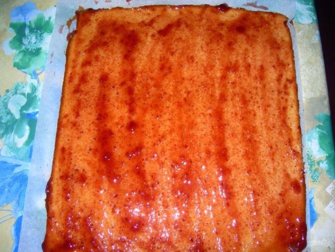 Пока корж горячий, смажьте его джемом и аккуратно заверните.
