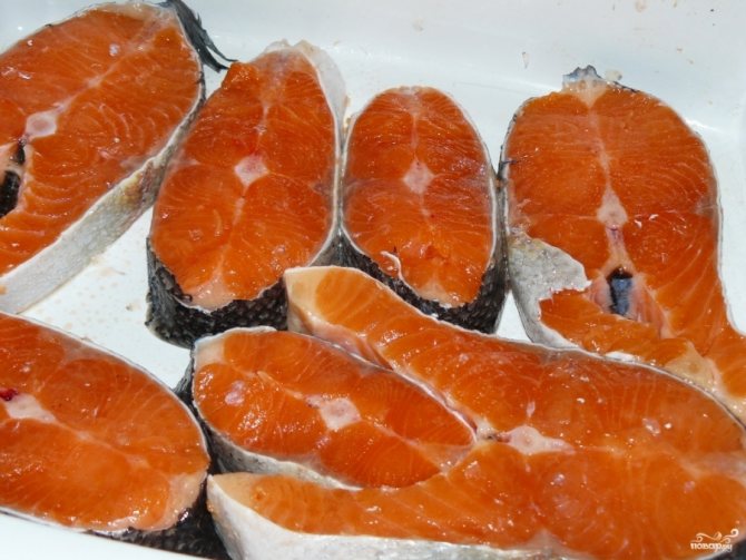 Сначала разделайте тушку форели, очистите её и нарежьте на стейки. Куски форели посолите и выложите в форму для запекания.