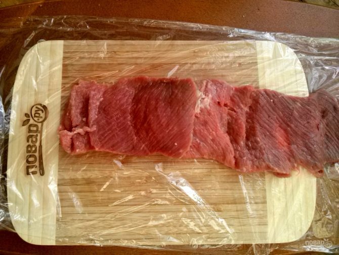 Говядину промойте, отбейте. Выкладываем на пищевую пленку.