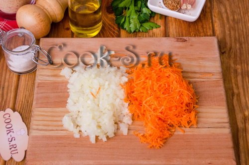 Также для приготовления постных котлет из перловки возьмём лук и морковь. Очищаем их и измельчаем: лук режем мелким кубиком, а морковь натираем на металлической тёрке с мелкими зубьями.
