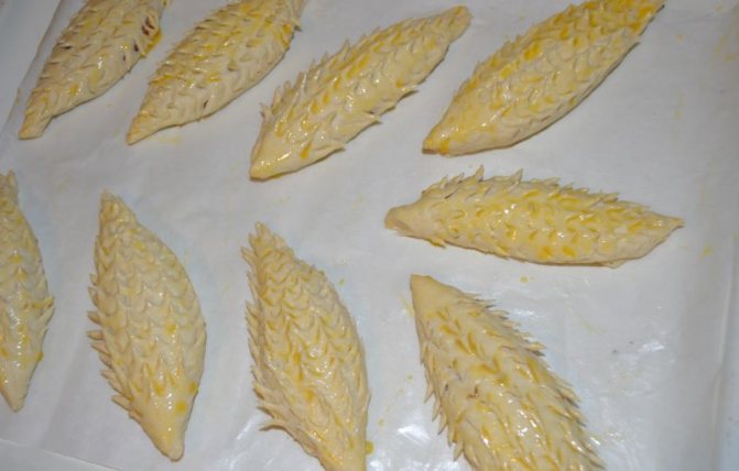 Выложите заготовки на противень и смажьте яичным желтком, предварительно размешанном вилкой. Чтобы корочка блестела в желток можно добавить щепотку сахара.