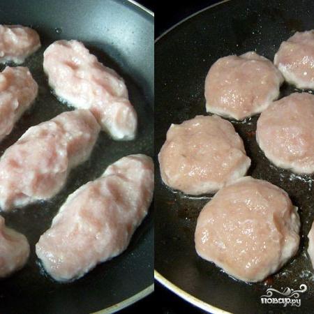 2. Отбить фарш. Разделить пополам. Котлеты в тесте у нас будут разной формы. Из половины фарша мы налепим узкие батончики, а из второй половины слепим круглые лепешки. Обжарить котлеты на масле не до готовности, а чуть-чуть до корочки. Отложить котлеты, чтобы остыли.