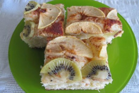 Очень нежным получается пирог с творогом, приготовленный с начинкой из яблок и киви. Готовится он просто и быстро, этот десерт понравится любителям выпечки с влажным мякишем.