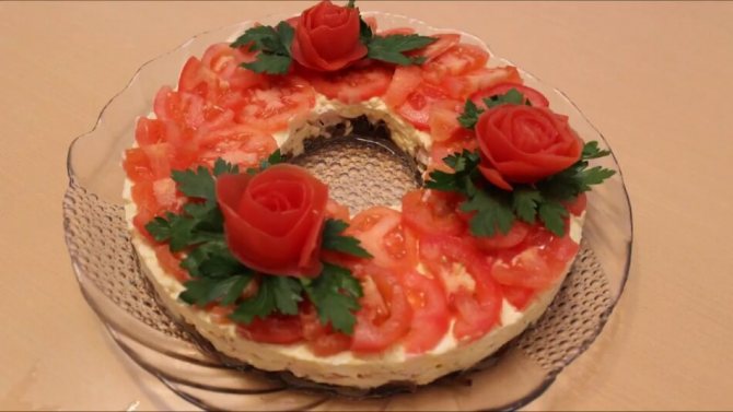 Пока салат стоял один час в холодильнике он полностью пропитался. Теперь нужно его украсить помидорами сверху. Салат получается очень вкусным и на вид выглядит очень аппетитным. Мужчины очень любят этот салат и в первую очередь со стола съедают его))). Салат любимый муж очень будет кстати к любому праздничному столу, будь то день рождения или Новый Год.
