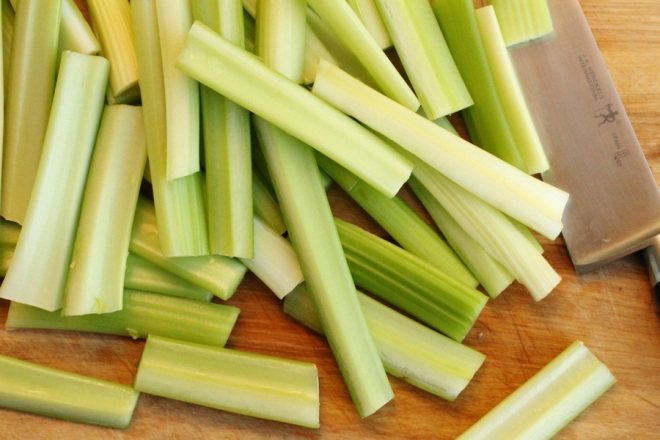 - Довести воду в кастрюле до кипения и пробланшировать сельдерей до мягкости.