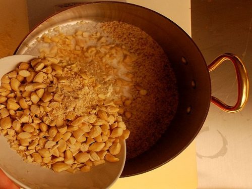 - Бланшировать миндаль и очистить его от кожуры. Крупно порубить удобным для вас способом.