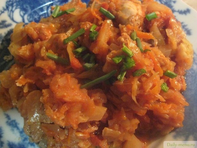 Краткий состав готового блюда: «Тушеная капуста с куриным филе»