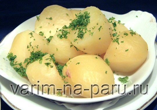 Как правило, варка картофеля в мультиварке займёт у вас 30 – 35 минут. После окончания приготовления необходимо слить лишнюю воду, поместить отварной картофель на блюдо, сверху посыпать измельчённой зеленью и добавить немного сливочного масла (при желании).
